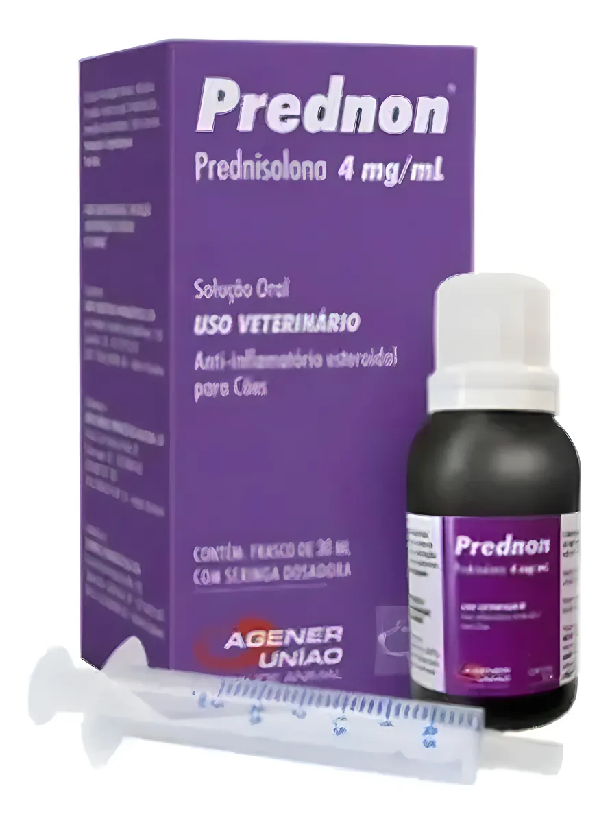 O Prednon apresenta-se em solução oral, facilitando a dosagem precisa e o uso, garantindo melhor adesão do animal ao tratamento. Cada frasco contém 30 ml do medicamento, acompanhado de uma seringa dosadora para administração correta e prática. Recomendado exclusivamente para cães, seu uso deve ser orientado por veterinário.