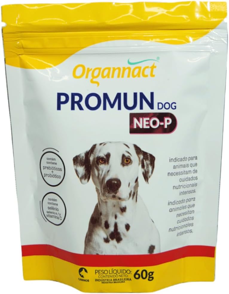 O Promun Dog Neo P da Organnact é um suplemento nutricional para cães, ideal para animais que necessitam de cuidados nutricionais intensos. Este suplemento contém prebióticos e probióticos que auxiliam na saúde digestiva, além de selênio, vitaminas C e E que colaboram para o fortalecimento do sistema imunológico do seu pet. Com embalagem de 60g, é indicado para ajudar na recuperação e manutenção do bem-estar do seu cão, contribuindo para uma melhor absorção dos nutrientes essenciais.