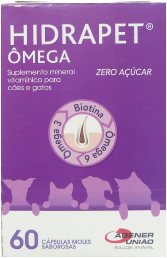 O Hidrapet Ômega é um suplemento mineral vitamínico especialmente formulado para cães e gatos, que oferece uma combinação potente de Ômega 3, Ômega 6 e biotina. Esse produto é ideal para melhorar a saúde da pele e pelagem dos pets, promovendo brilho e resistência contra alergias e irritações. Suas cápsulas moles saborosas facilitam a administração, garantindo melhor aceitação pelos animais. O suplemento contém zero açúcar, sendo uma opção saudável e segura para o cuidado diário dos pets. Vem em embalagem com 60 cápsulas, proporcionando um tratamento contínuo e eficaz.
